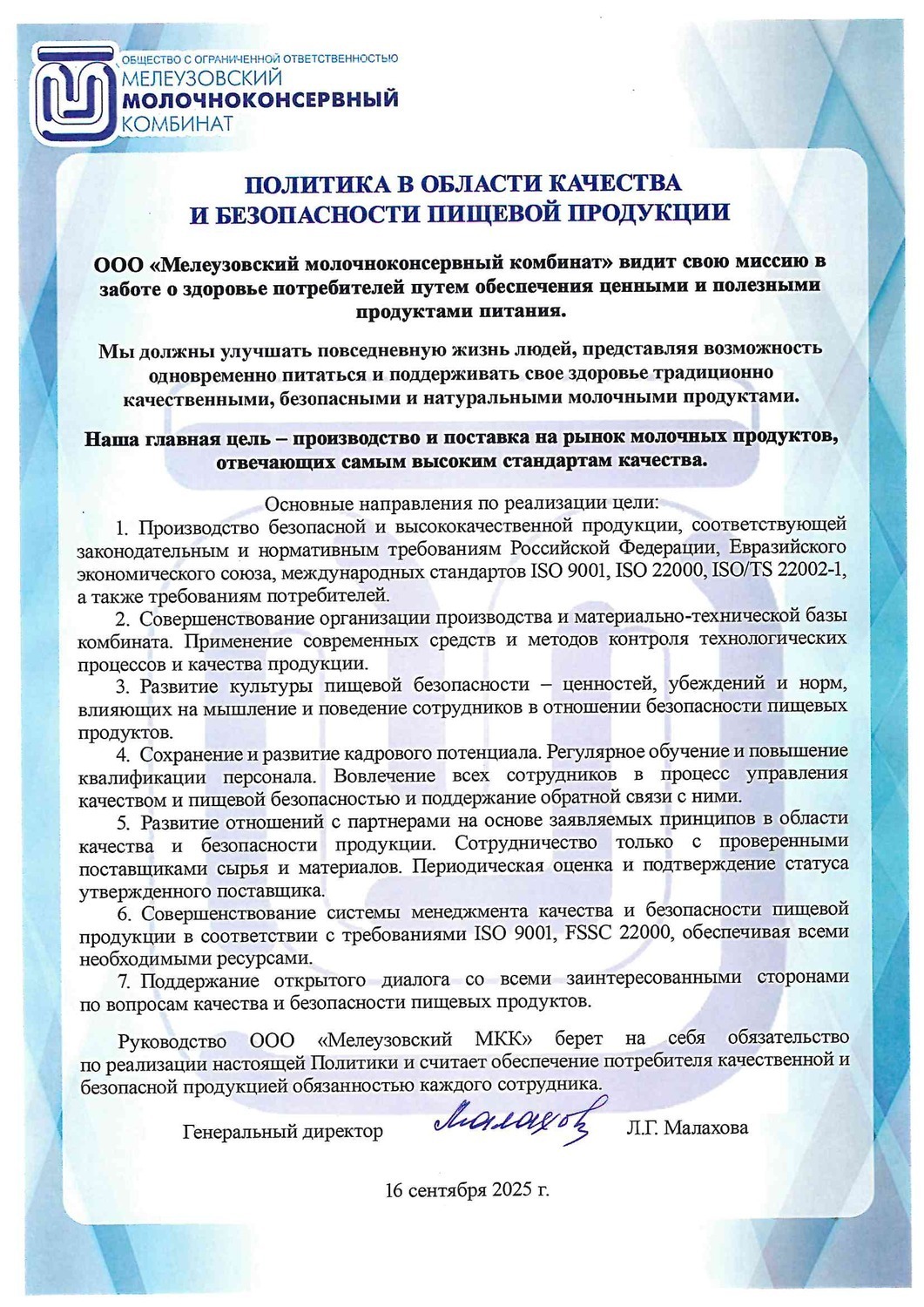 Вопрос качества и безопасности продукции является приоритетным для ООО «Мелеузовский МКК». Внедренная на комбинате Система менеджмента качества и безопасности пищевой продукции сертифицирована в соответствии с требованиями ГОСТ Р ИСО 9001 и схемы сертификации FSSC 22000.